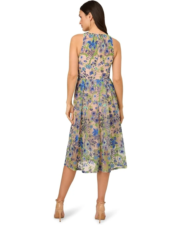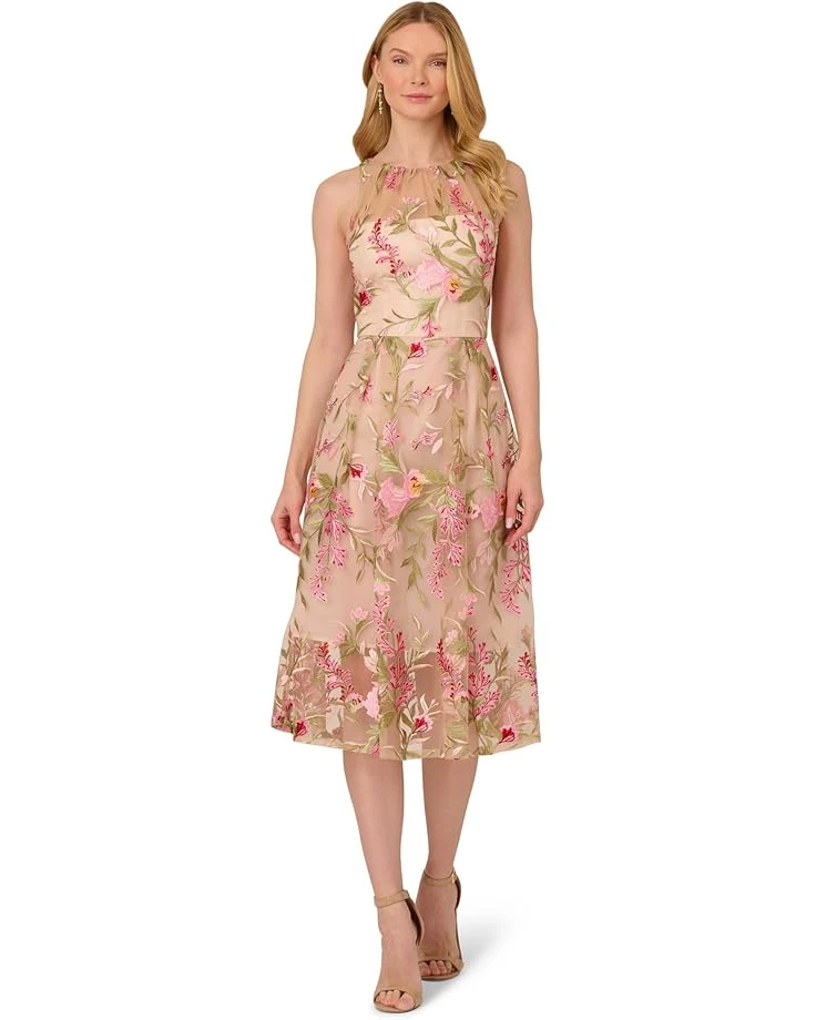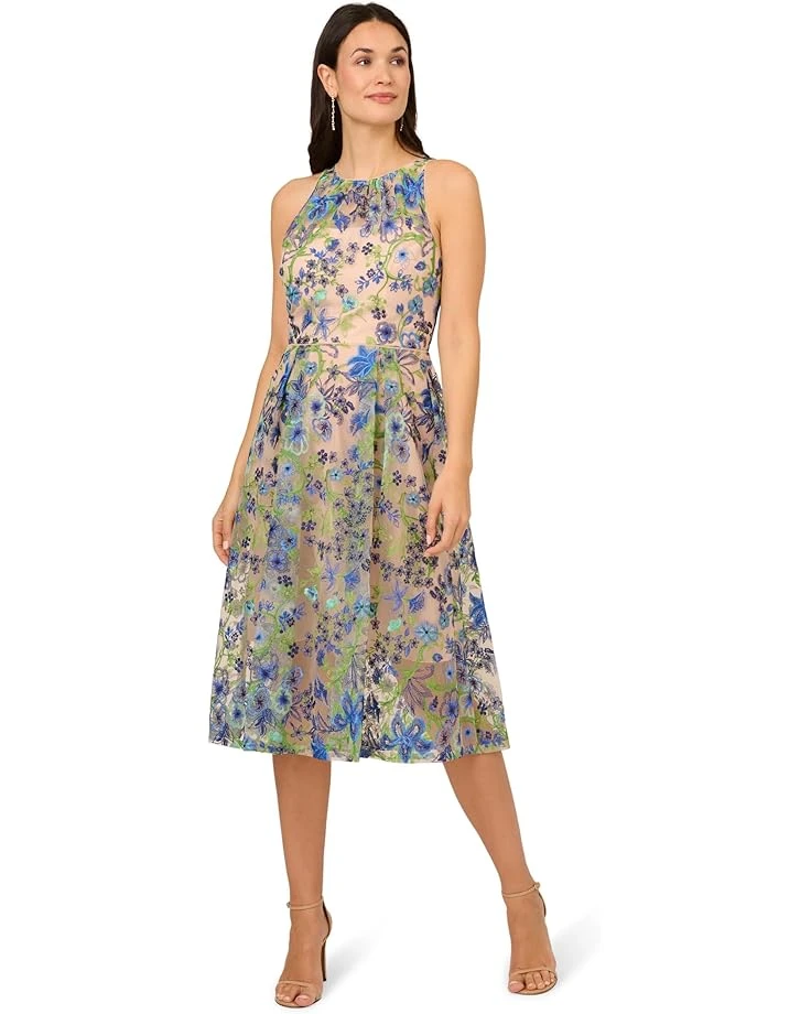 - Whether you are headed to a cocktail party or a dinner date, the Adrianna Papell® Embroidered Fit and Flare Dress beautifully complements your elegant personality while ensuring that you do not lose comfort. Framed in an iconic fit-and-flare silhouette, this sleeveless dress features a mock neckline with a zippered back closure and highlights an intricate floral embroidery work all over for a unique appeal. The flared skirt showcases gentle pleats for added movement and swing and finishes slightly below the knee.