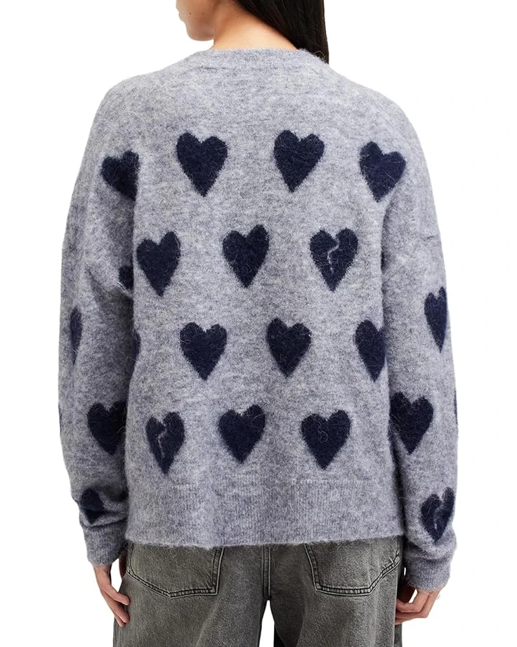 - Fall in love styling the AllSaintsâ„¢ Amora Jumper-the perfect blend of style and comfort for cozy season! Crafted from a responsibly sourced wool-blend yarn, this jumper boasts a soft, brushed, and hairy texture that feels as good as it looks. The adorable love-heart jacquard motif adds a touch of sweetness, while the ribbed trims and crew neck bring classic charm. Designed in a regular fit with long sleeves, this pullover is a must-have for your fall wardrobe.