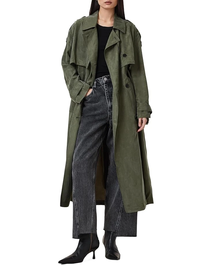- Make a statement wearing the AllSaints™ Linnie Trench coat. With its classic notched lapel collar, stylish long sleeves with belted cuffs, and an adjustable removable tie belt, this coat offers both sophistication and versatility. The gun flap detail and buttoned front closure provide a touch of urban edge, while the storm flap and back vent deliver practicality and comfort.