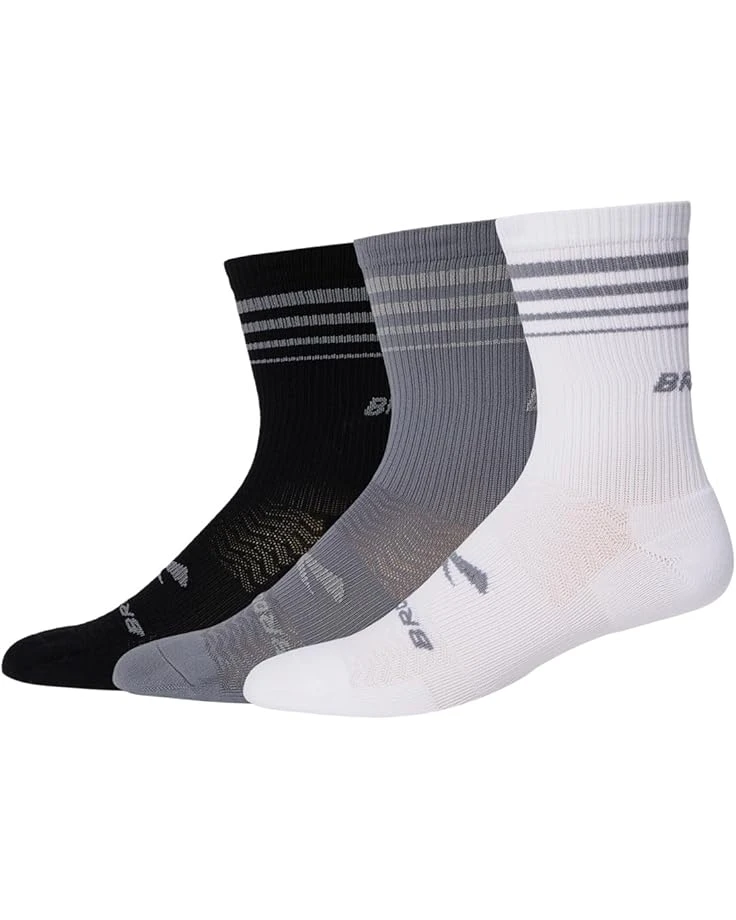 - Power through every run wearing the Brooks® Run-in Crew 3-Pack, designed for ultimate performance and all-day comfort. Featuring a Y-heel pocket for a locked-in fit, these technical running socks stay in place no matter how far you go. The wider arch construction and midfoot compression provide enhanced support, reducing foot fatigue and keeping you focused on your run. Crafted for distraction-free comfort, the moisture-wicking fabric keeps your feet cool and dry, while the breathable design ensures airflow where you need it most. With a pull-on design for effortless wear and durability to handle every mile, these socks are your go-to for high-performance running.