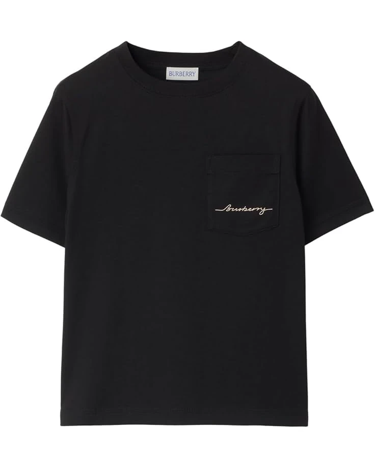 - This Burberry® Kids Cedar Logo Script T-shirt is perfect for your little one! Made with a ribbed crew neckline, short sleeves, and a classic fit, it’s both comfortable and stylish. The pull-on style makes it easy for kids to put on themselves. Plus, the patch pocket on the left chest with the brand logo script adds an iconic touch.