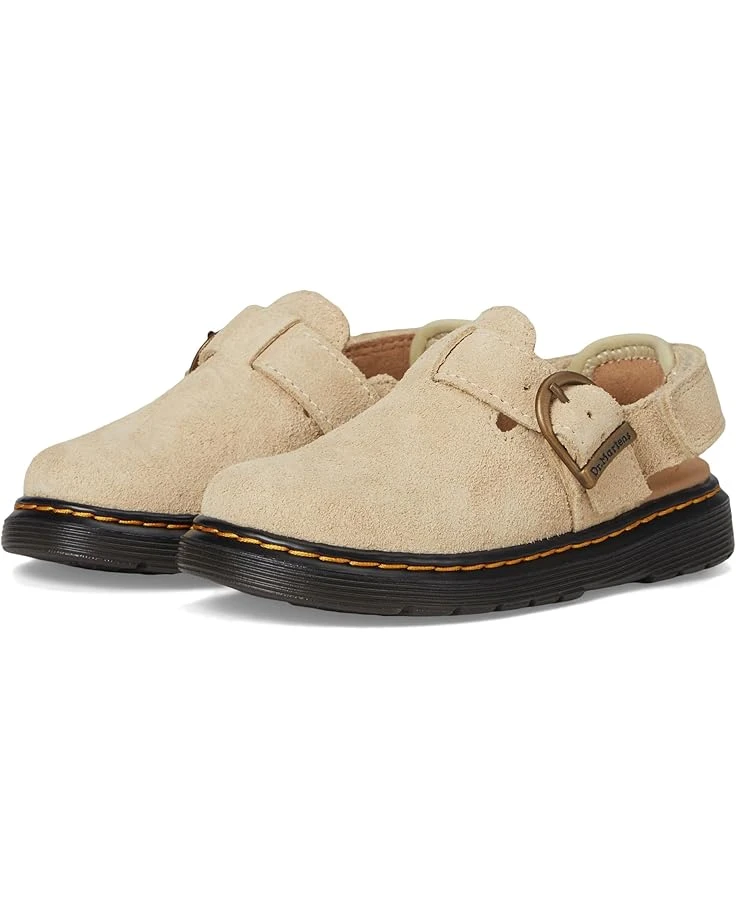 - The Dr. Martens® Kid’s Collection Jorgie J, a wear-anywhere Dr. Martens mule built from soft Bronx suede that’s versatile enough for any season. Built on a flexible sole and fitted with adjustable straps to keep active, growing feet comfortable. These shoes feature leather upper, polyester lining, EVA insole, and polyvinyl chloride outsole.