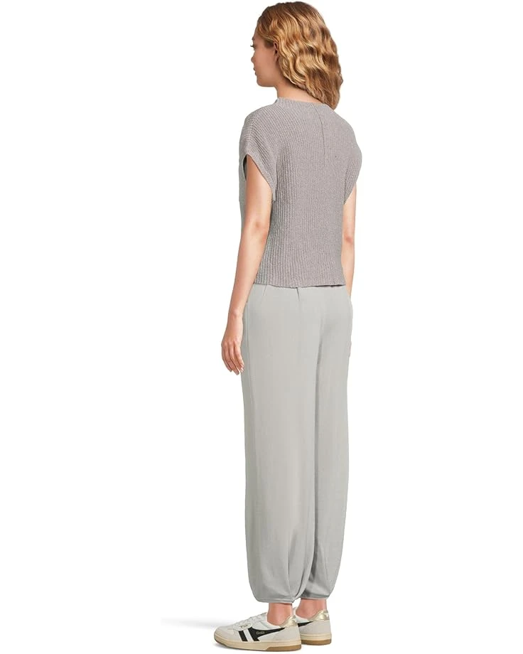 - Pants feature an elastic waistband, side hand pockets, exaggerated pleating at the top, and elastic cuffs.