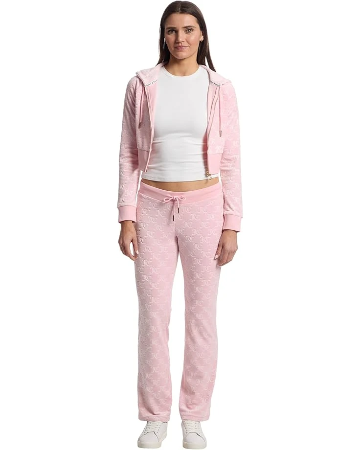 - Beyond comfort, an icon: Juicy Couture® Embossed Velour Track Pants. Designed with a high-rise fit and a sleek flat front, these track pants sculpt a flattering silhouette while keeping you effortlessly cozy. The pull-on design with a drawcord closure ensures a customizable fit, perfect for lounging or street-styling. Crafted from sumptuously soft velour, these pants exude a touch of glamour, featuring an all-over embossed logo that adds signature Juicy charm.
