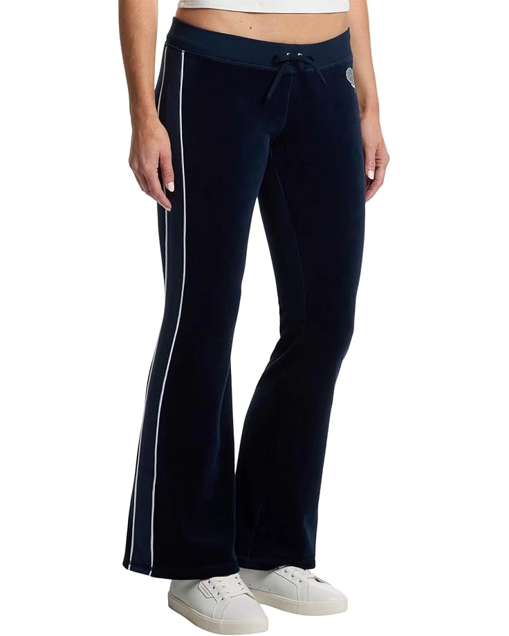 - Velvet reverie: Juicy Couture® Heritage Low Rise Track Pants With Side Stripe. Crafted from ultra-soft cotton velour, these track pants redefine sporty-chic with a high-rise fit, sleek flat front, and pull-on ease. The adjustable drawcord closure ensures the perfect fit, while the striped side trim adds a pop of retro-cool energy. Whether you’re channeling ’90s nostalgia or elevating your athleisure game, this piece is a must-have from the exclusive tennis capsule.