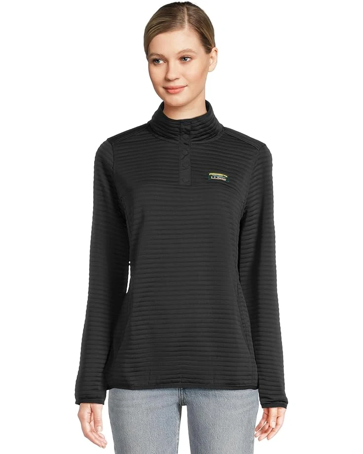 - Light as air and surprisingly warm, the L.L.Bean™ Airlight Knit Pullover Women’s Regular offers weightless comfort and a stylish look. The thin, low-profile baffle construction actively increases thermal efficiency. Plus, the quilted pullover features a mock neck with a quarter snap-button closure, long sleeves, brand logo detail on the left chest, two hand pockets on the front, and a straight hem.