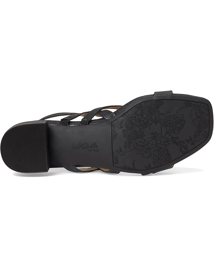 - Effortless chic, all day long: The LifeStride® Janet strappy sandals are the perfect combination of style and comfort. Featuring a sleek polyester upper and modern open square toe, these sandals boast chic strappy detailing and an adjustable buckle strap closure with built-in stretch for a customized fit. The slingback design adds a touch of sophistication, while partially recycled PU linings showcase an eco-friendly edge. Engineered with trusted Soft System® comfort technology, enjoy superior cushioning, support, and flexibility, complemented by a foam insole and full-length cushioned footbed for heel-to-toe bliss. A durable synthetic rubber outsole ensures reliable traction and stability for every stride.