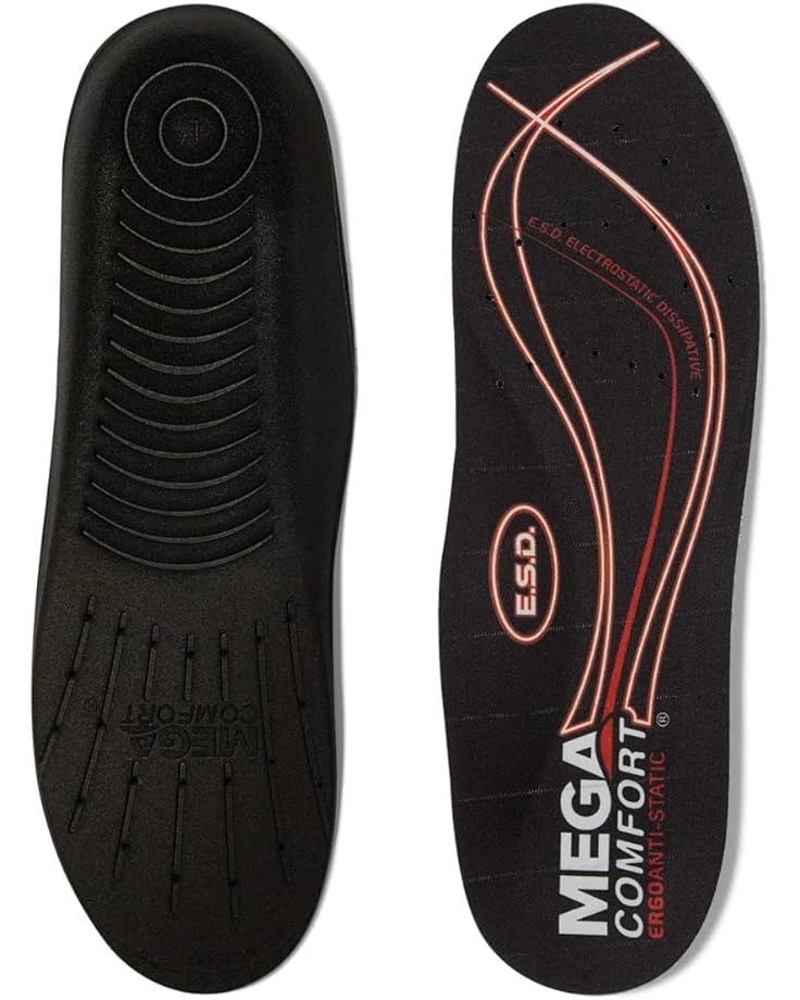 - MEGAComfort’s Ergo Anti-Static Insole is the ultimate solution for comfort, safety, and protection in static-sensitive environments. Designed with patented dual-layer memory foam and SD10 Static-Dissipating Foam, these insoles offer superior electro-static discharge (ESD) protection while providing exceptional all-day comfort. Certified to meet ASTM F2413-18 standards, they are perfect for workers in industries like electronics, chemical handling, and manufacturing. Say goodbye to foot fatigue and muscle strain-these insoles reduce discomfort, enhance stability, and keep you focused on the task at hand. With MEGAComfort’s Ergo Anti-Static Insole, you’re not just protected, but empowered to stay safe, comfortable, and productive throughout your day.