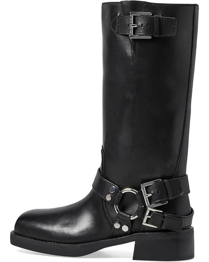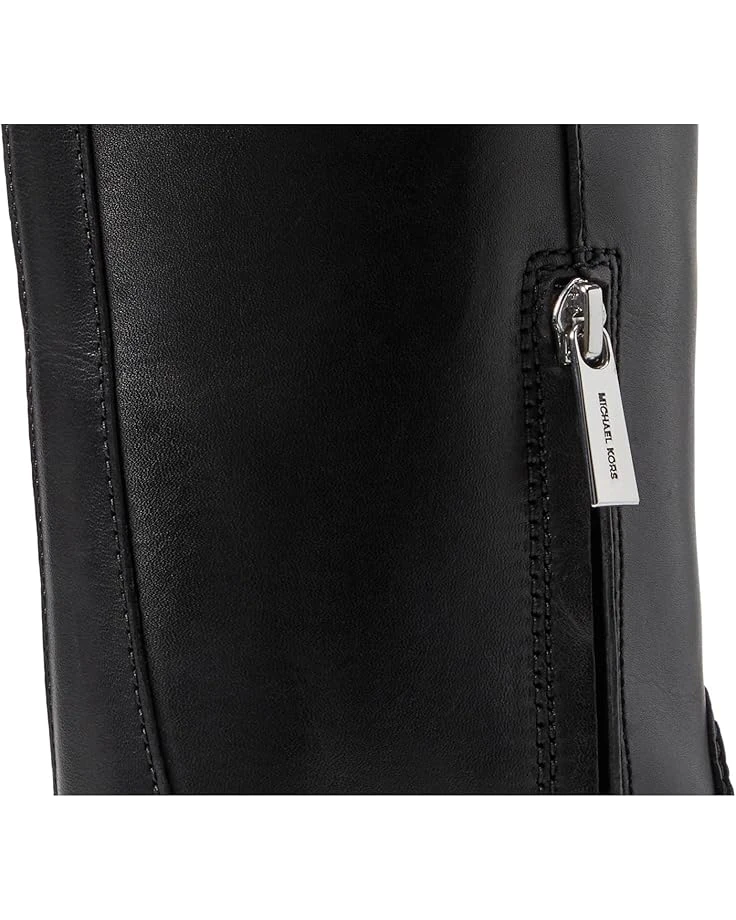 - The MICHAEL Michael Kors® Crosby Moto Boots are inspired by the timeless motorcycle boot featuring a modern exaggerated squared toe silhouette and sturdy moto hardware for a rugged and edgy attitude. These boots are crafted with a leather upper with a knee-high length, buckle gore, and a zippered side closure. The synthetic insole and polyester lining keep your feet comfortable. Add a bold look to your outfits wearing these heeled leather boots.