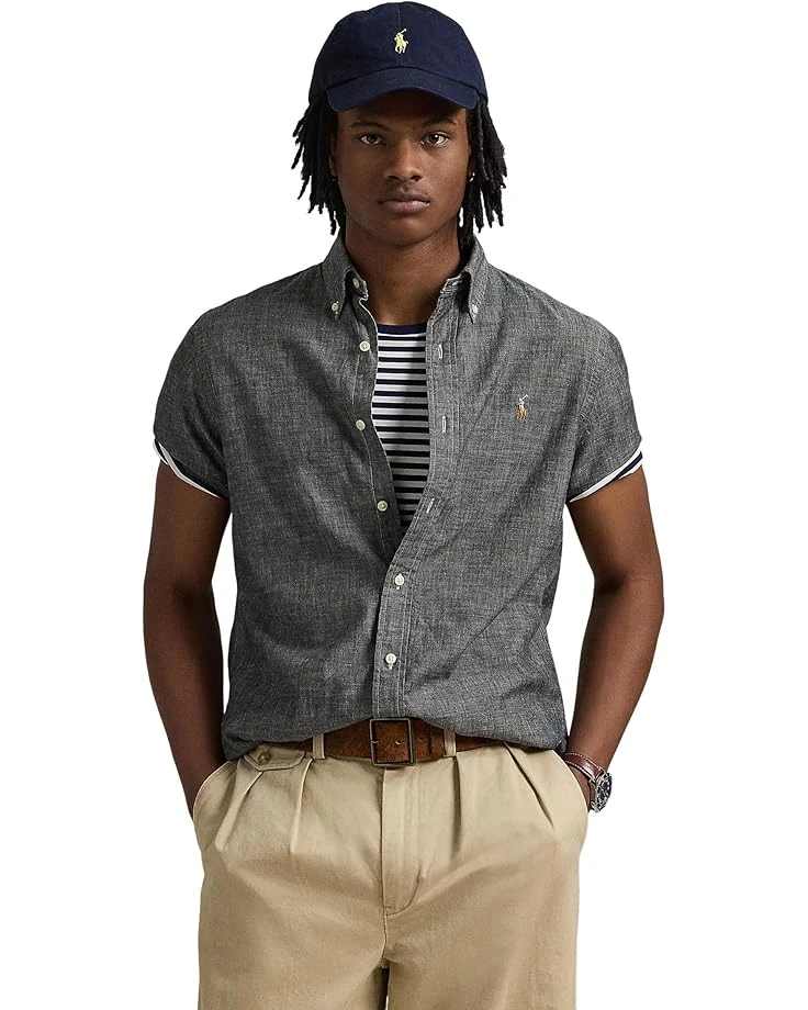 - The Polo Ralph Lauren® Classic Fit Chambray Shirt is cut for a roomy fit and washed to give the lightweight fabric a weathered, lived-in look on a classic short sleeve front button closure shirt with pointed collar.