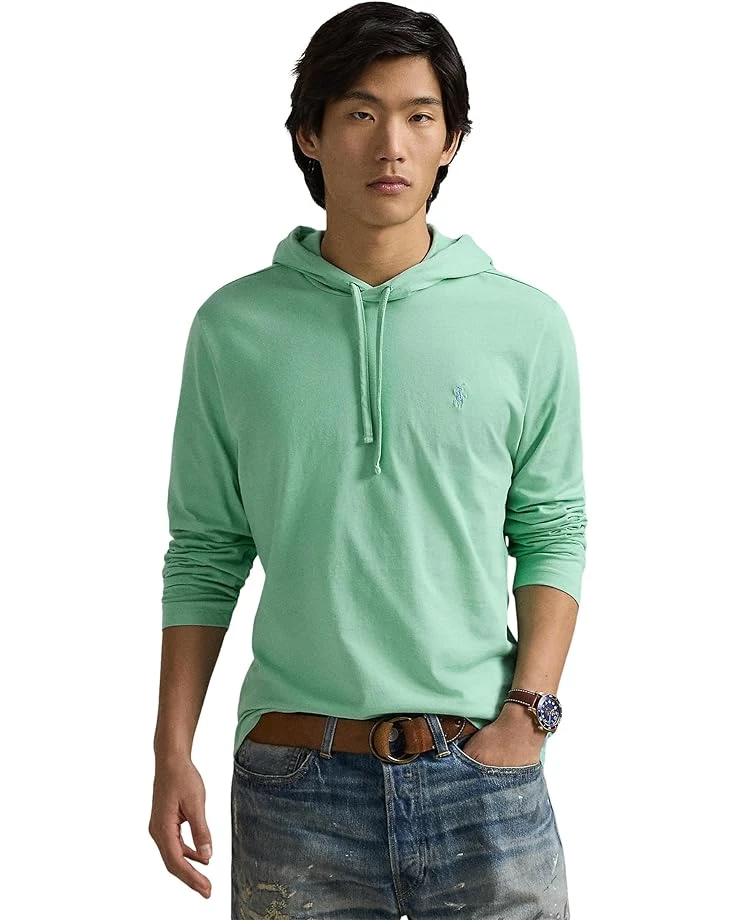 - The Polo Ralph LaurenĀ® Jersey Hooded T-Shirt is constructed of cotton and features a drawstring hood on a long sleeved tee for a soft and comfortable shirt.