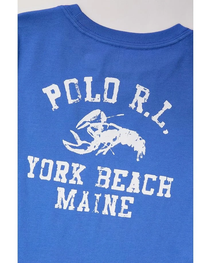 - The Polo Ralph Lauren® Kids Cotton Jersey Long-Sleeve Graphic Tee brings coastal charm to everyday wear. Inspired by New England’s seaside heritage, this soft cotton tee features a weathered lobster graphic on the left chest pocket and a bold “Polo R.L.” print with “York Beach Maine” on the back. Ribbed cuffs add a classic touch, while the crewneck and relaxed fit ensure all-day comfort. Perfect for layering or wearing solo, it’s a laid-back staple with a vintage-inspired twist.