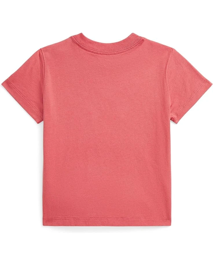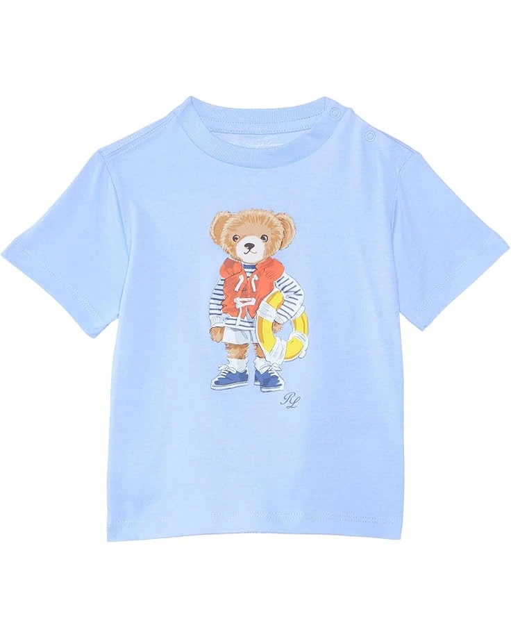 - Crafted from soft cotton, the Polo Ralph Lauren® Kids Polo Bear Cotton Jersey Tee features a rounded two snap-button placket neckline, short sleeves, “Polo Bear by Ralph Lauren,” and “Ralph Lauren” script printed at the center front with bear design, and a straight hemline.