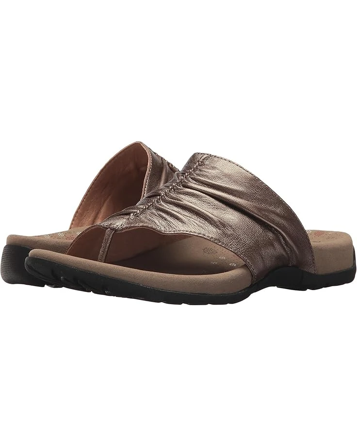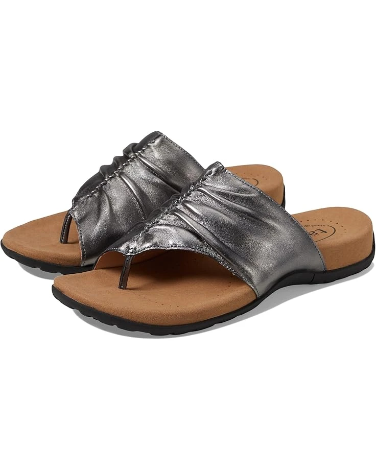 I saw this sandal on a friend last summer, and I fell in love with the style. When she told me they were Taos. I was even more interested because their arch support is recommended for plantar fasciitis. I finally got around to ordering a pair, and I am not disappointed. They felt comfortable immediately–velvety soft insole and the toe peg does not irritate, a major concern with thong styles. The metallic color makes them suitable for dressing up or down, and I plan to wear them on my next cruise with my dressy pants outfit. Oh, and the size 11, my usual size, is a perfect fit.