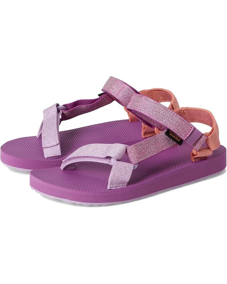 - A mini remake of the adult’s Original Universal, the Teva® Kids Original Universal Metallic sandals are kid-friendly water sandals that are geared for outdoor adventures with water-loving straps made from recycled plastic. Geared for free-spirited little ones, the nylon upper features an easy hook-and-loop closure that comes on and off quickly and gets the fit just right. Treated with Life Natural, a responsibly sourced peppermint-based anti-odor treatment, these sandals are crafted with a rubber insole, nylon lining, and EVA-foam midsole for lightweight cushioning. Their quick-webbing straps are made from 70% recycled plastic using traceable, verifiable REPREVE polyester yarn by Unifi and 30% metallic yarn that supports your foot and stands up to abuse. The multiple points of adjustability of these athletic sandals offer the absolute perfect fit.