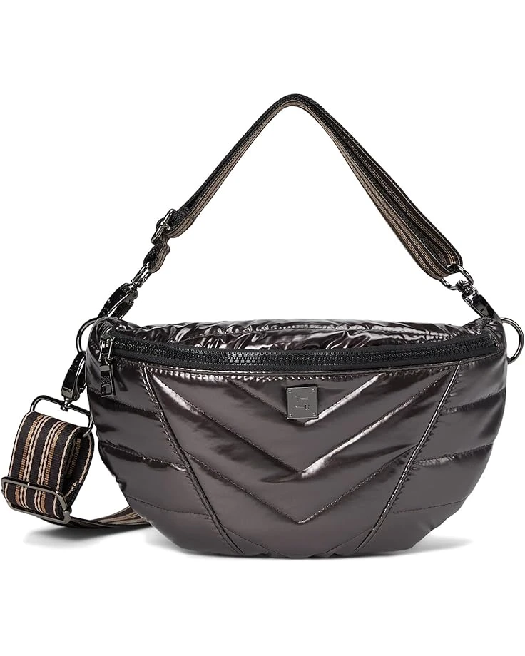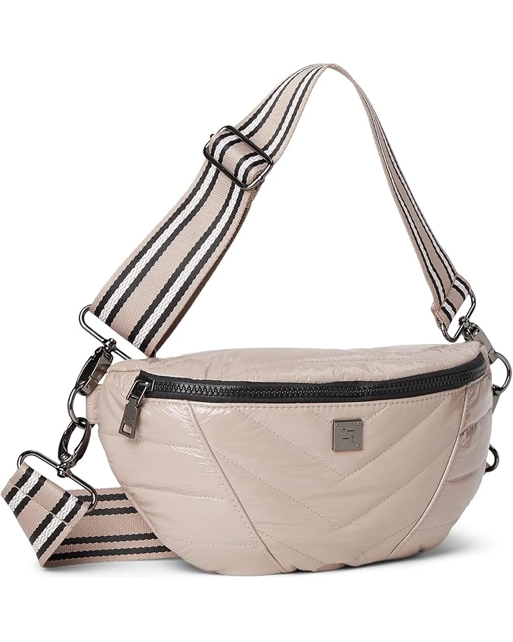 - Embrace perfection in the palms of your hands by carrying the THINK ROYLN® Little Runaway−a fanny pack that adds a cool flair to your collection. The glossy exterior, adorned with the brand’s signature quilting, not only looks chic but also houses a spacious compartment. Secure your essentials with a zippered closure and enjoy versatility with two adjustable, detachable straps. Additionally, discover convenience with a discreet zippered interior pocket on the back.