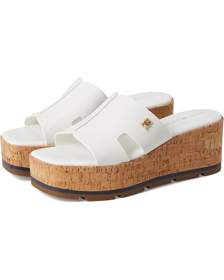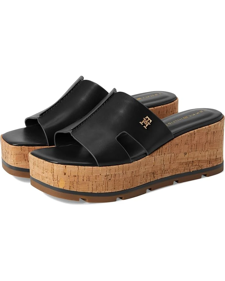 - Give a touch of glam to your look wearing the Tommy Hilfiger® Heliena. Crafted from polyester upper, lining, and leather insole, this pair of sandals features open round toe, wide strap detailing, slip-on style, and brand detailing on the footbed. The sandal sandal covered in cork and set on a stable platform and wedge will inspire you to stride with confidence and style whether you’re on the boardwalk or sand.
