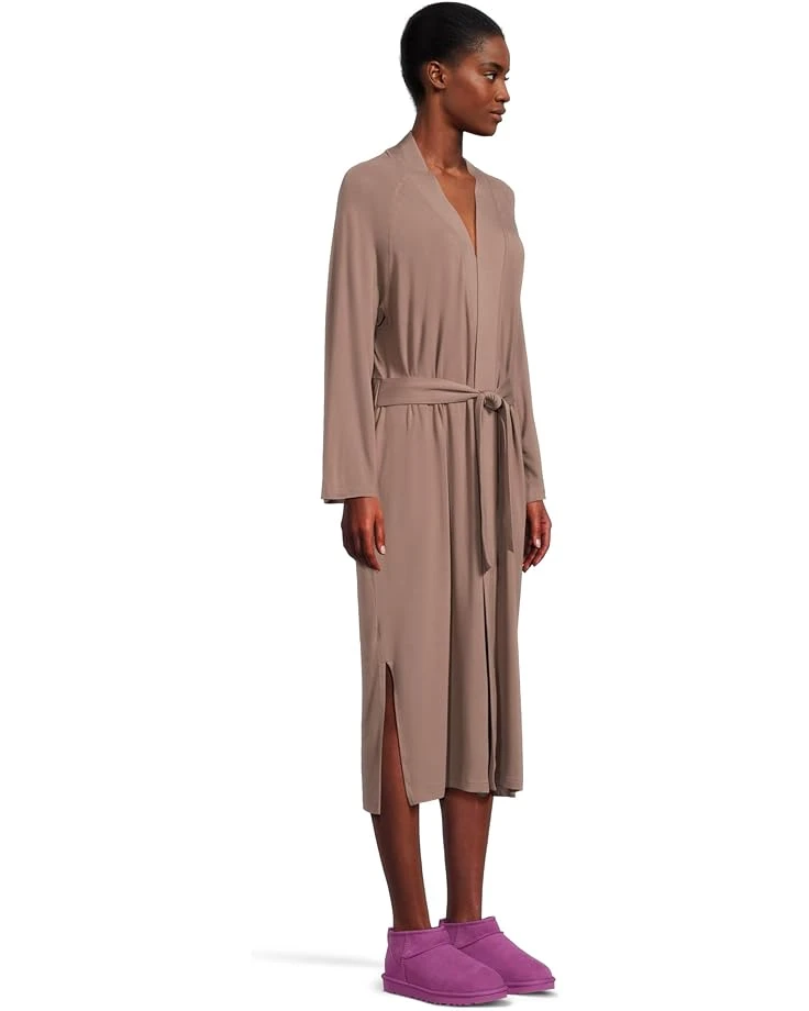 - Styled with a fixed waist tie belt with a cinched back, the UGG® Myra Robe is designed to bring you superior comfort and style. Made from a viscose and elastane blend for a drapey fit, this midi-length robe also comes with a cotton hanger loop. It is designed with Bracelet length sleeves, side slits, a V-neckline, and a straight hem. Comfortable and stylish, this robe features the UGG® logo woven flag label clamped on the wearer’s left pocket.
