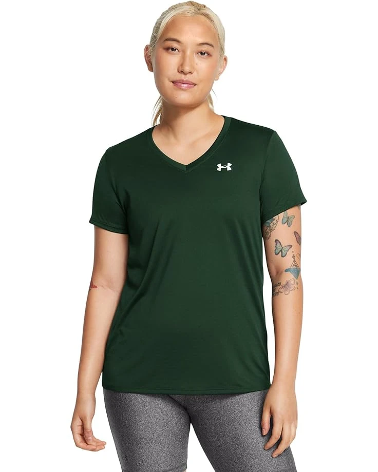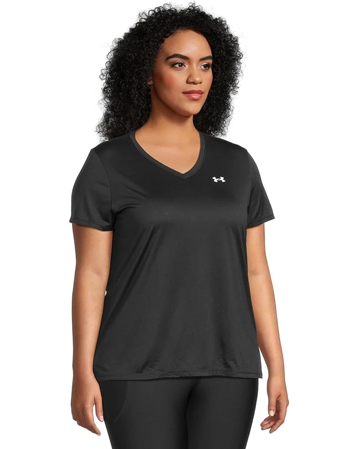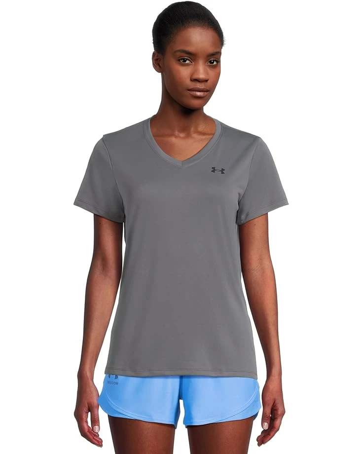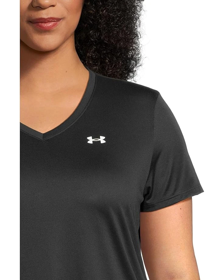 - Pair your jeans or trousers for a sporty look by wearing Under Armour® Tech Short Sleeve V-Neck Solid tee. It features a pull-on style, V-neckline, and short sleeves. The straight hem and signature brand logo on the left shoulder gives it a subtle yet chic look.