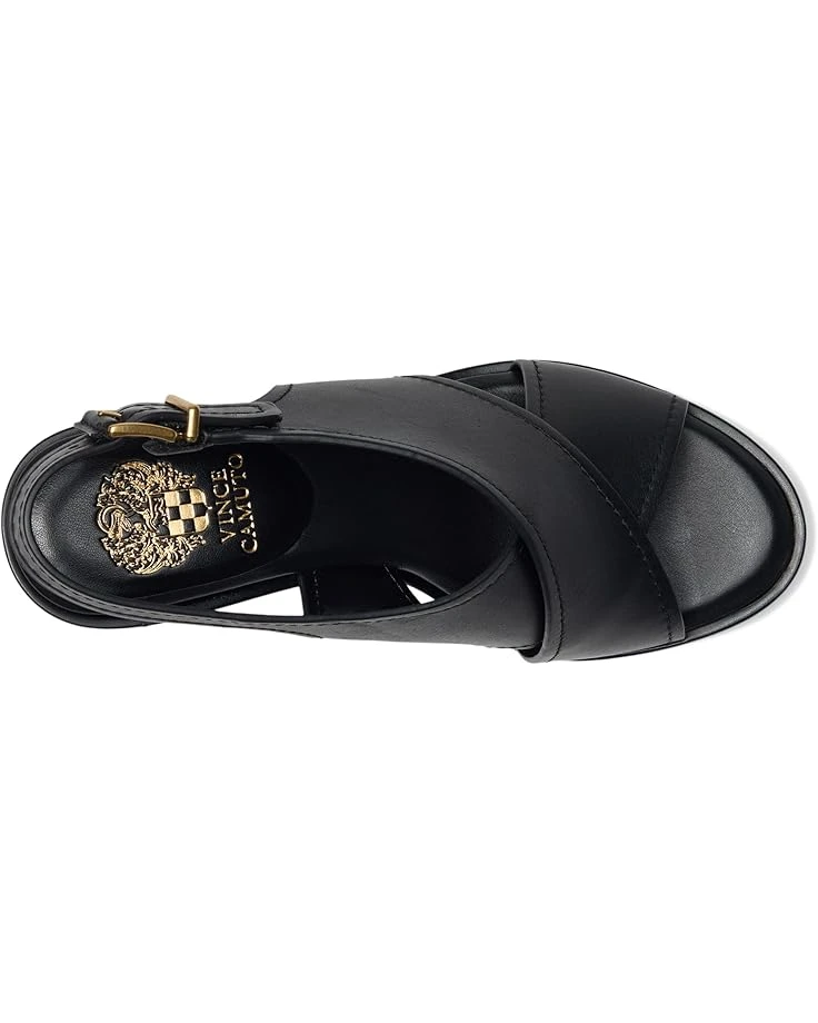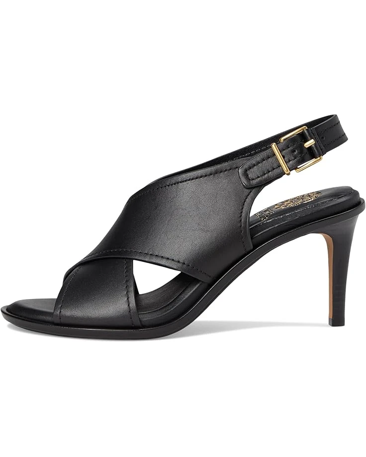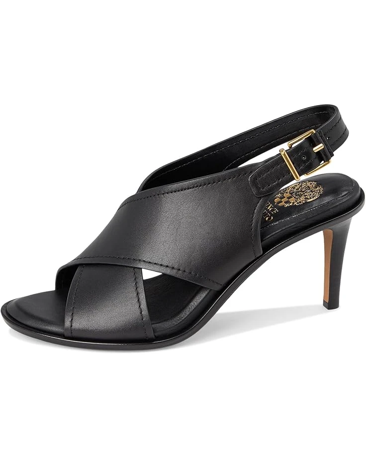 - Walk like you own the world wearing the Vince Camuto® Famla Cross-band High Heel Sandals. Crafted from leather upper, synthetic lining, and insole, this pair of sandals features round toe, crisscross X-band detailing on the upper, stiletto heel, buckle closure slingback strap, and brand detailing on the footbed.